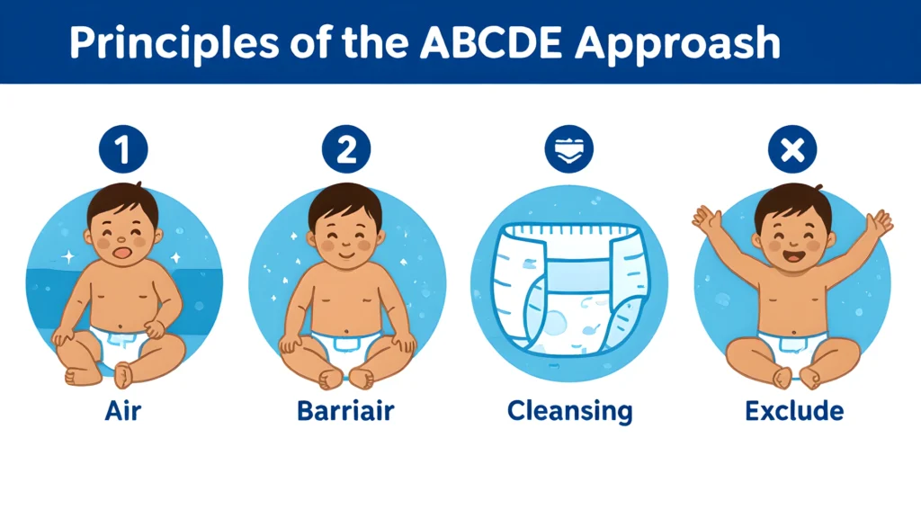 - [Reference 3] Principles of the ABCDE approach in diaper rash management (Air, Barrier, Cleansing, Diapers, Exclude).